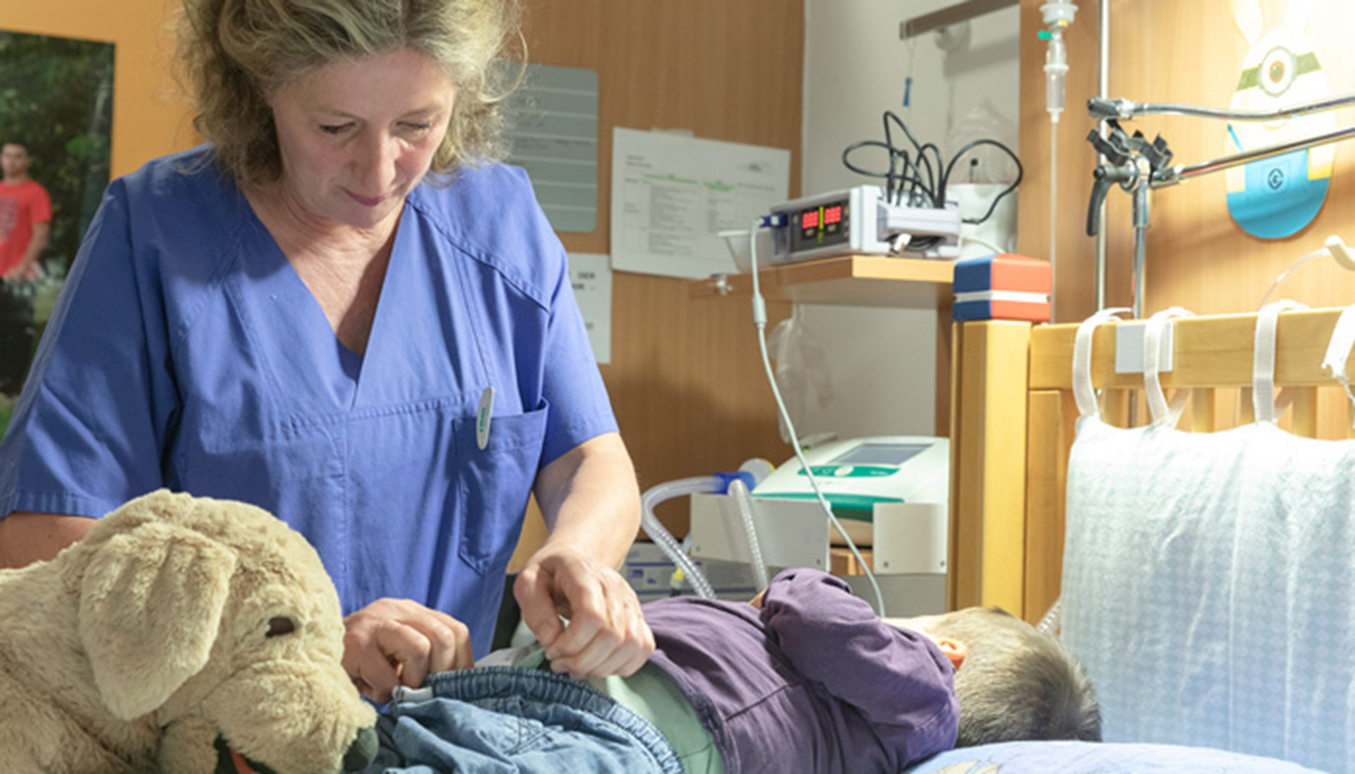 RB: Allen voran bilden hier Frau Mosler, Oberärztin und Fachärztin für Anästhesie und Intensivmedizin und ich, Chefarzt und Facharzt für Anästhesie und Palliativmedizin, die medizinische Leitung. Wir holen uns bei Bedarf Unterstützung von Ärzten aus den entsprechenden Fachrichtungen der Kinderklinik. Besonders wichtig sind natürlich die Pflegekräfte, die sehr engen Kontakt zu den Kindern haben und sie täglich betreuen. Neben den Ärzten und Pflegekräften gibt es Physiotherapeuten, Pädagogen und Heiltherapeuten. Durch tägliche Krankengymnastik, Musik- und Kunsttherapie oder tiergestützte Therapie, werden die Kinder in ihrer Entwicklung unterstützt.